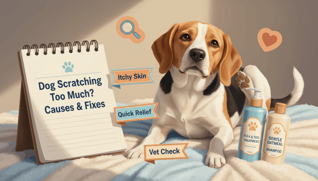 A scratching dog is an unhappy dog but with the right products and care, most cases can be managed at home.Start with flea control, gentle shampoos, and supplements, and if things don’t improve, check in with your vet.Your pup deserves to feel comfortable in their own skin.