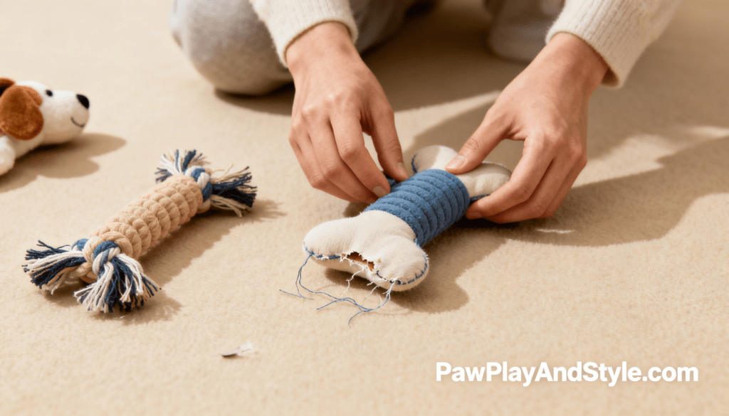 Worn out toys can become dangerous. Inspect toys frequently for any signs of damage such as cracks, loose parts, rough edges, torn fabric, or exposed stuffing. Damaged toys can cause choking hazards or blockages if swallowed. If a toy smells bad, shows discoloration, or appears unsafe, it should be thrown away immediately.