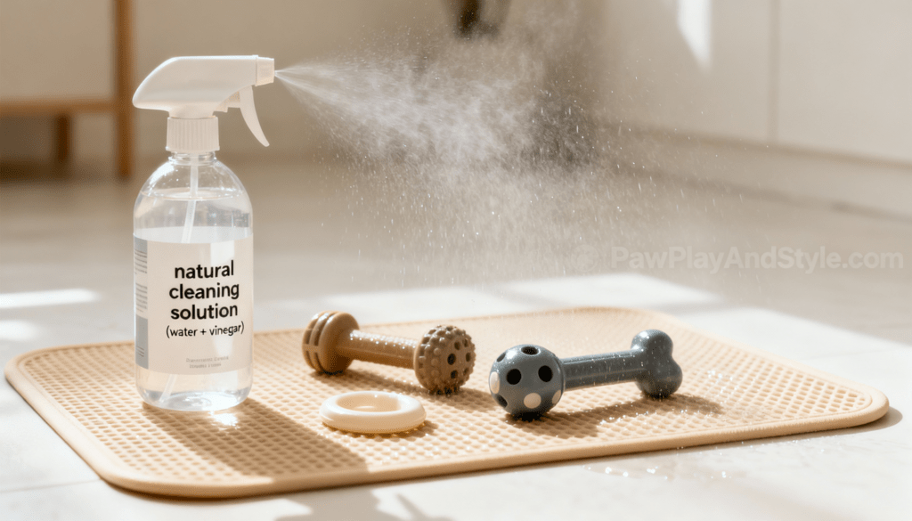 Use a pet safe disinfectant or a natural cleaning solution made from equal parts water and vinegar. Spray lightly and allow the toys to air dry fully before giving them back to your pet. Never use harsh chemicals such as bleach, as these substances can harm pets. Some rubber toys can be boiled for a short time to kill germs effectively.