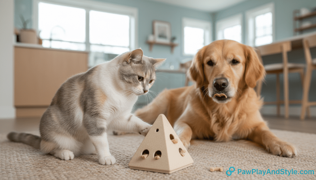 Puzzle feeders, scent searching games, slow treat challenges, and gentle interactive toys help your pet focus and think.